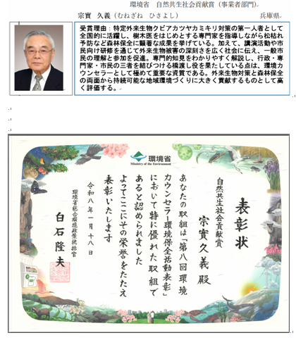 ご支援いただいてる皆様にご報告があります。市民団体として松枯れ対策を開始してからナラ枯れ、クビアカツヤカミキリ対策を樹木医、環境カウンセラーとして皆様と共に活動してきました。その功績を認められて1月18日に環境省から表彰して頂きました。これは個人としてでは無く、共に活動し、ご支援いただいた皆様の代表として頂いたと思います。引き続き微力ながら地域社会に貢献していきますのでご支援、ご協力の程宜しくお願いします。