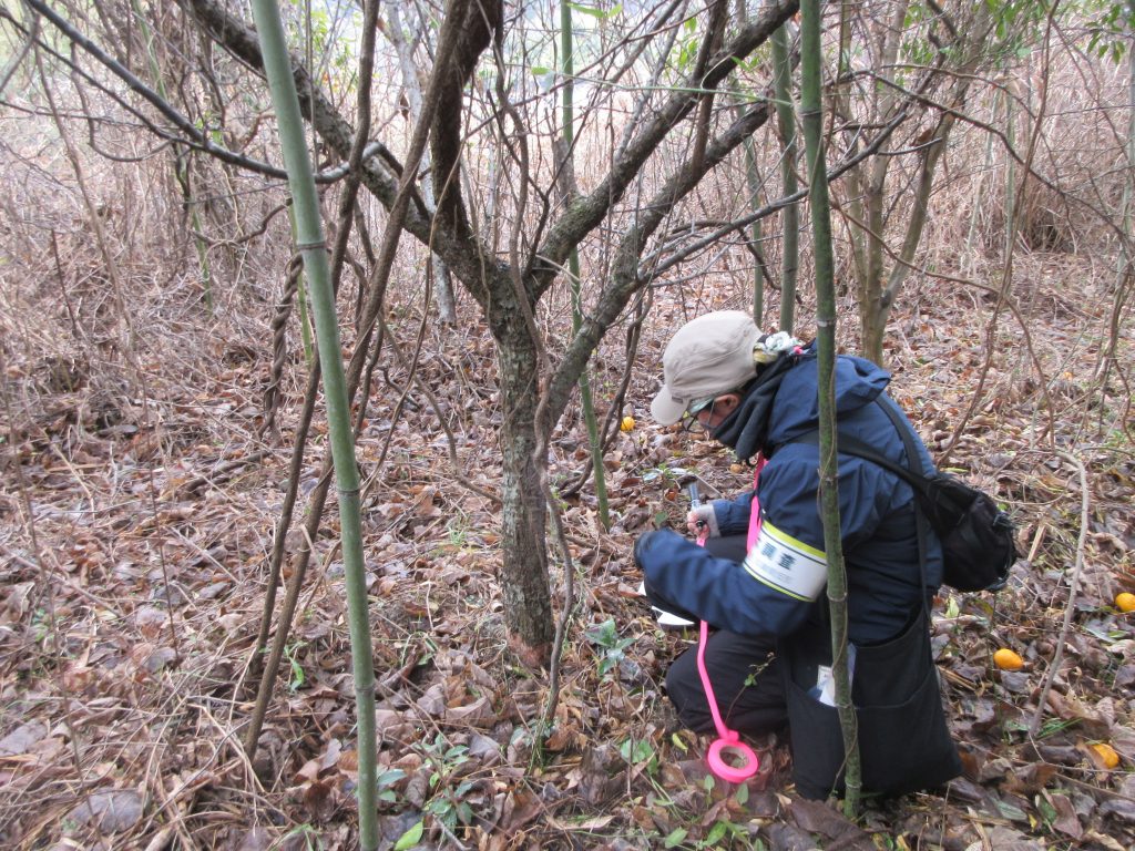 1月31日、当日の調査の様子 小雪が舞う極寒の日でしたが、放置果樹園の竹藪まで調査して決して被害木は見逃しません。これらの努力、活動が兵庫県では被害の拡散抑制に大きく寄与しています。
