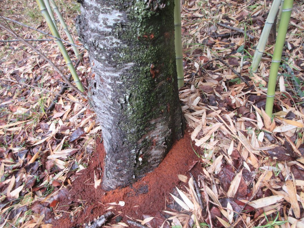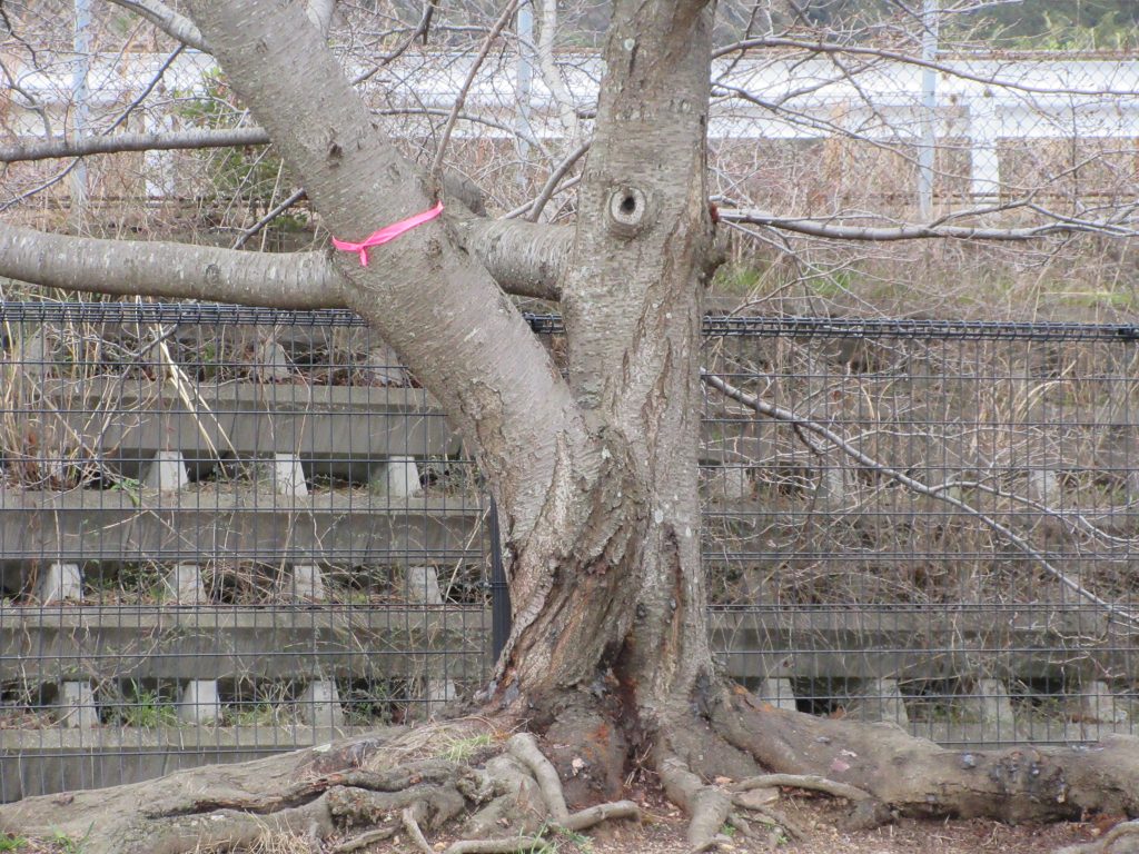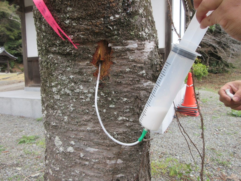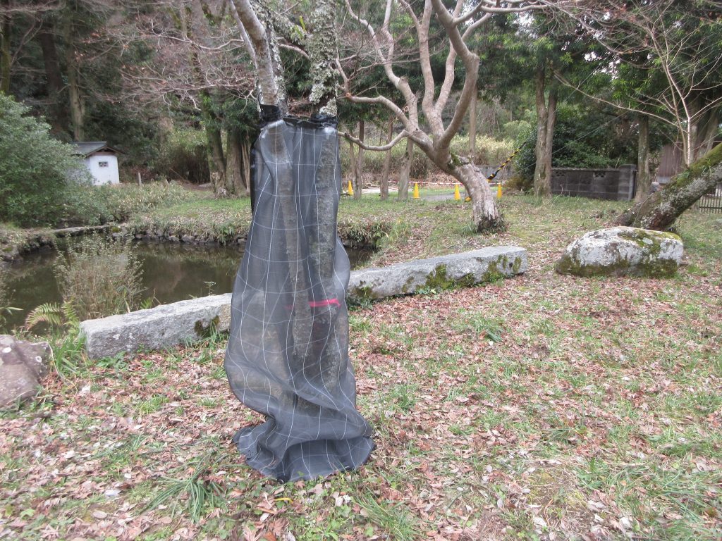 3月4日 和歌山県岩出市で被害木へのクビアカ対策が始まっています。幼虫捕殺、薬剤注入、ネット巻き。今後、順次伐採が行われます。