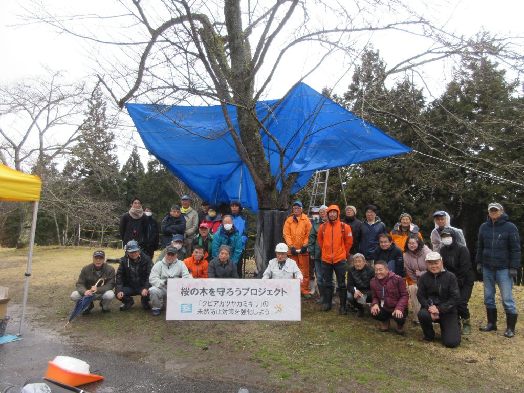 3月7日 兵庫県朝来市で「桜の木を守ろうプロジェクト」が開催されました。市民会館では座学、立雲峡ではネット巻きの実地研修が行われました。雲海で有名な「天空の城竹田城」周辺には貴重なサクラが多く生育しています。